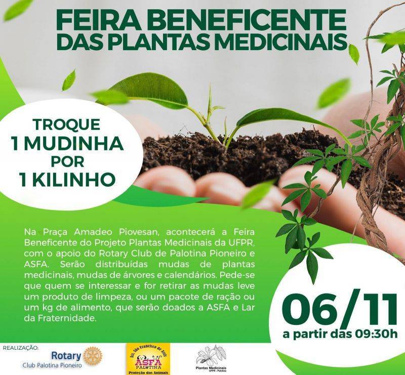 No dia 06/11 a partir das 09h30min na Praça Amadeo Piovesan, aconteceu a Feira Beneficente do Projeto Plantas Medicinais da UFPR, com o apoio do Rotary Club de Palotina Pioneiro e ASFA.