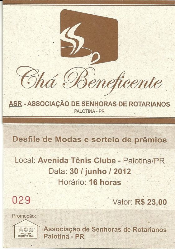 A Associação de Senhoras de Rotarianos de Palotina-Pr., convidam para um Chá Beneficiente a ser realizado no dia 30 de junho de 2012, äs 16:00, no Avenida Tênis Clube de Palotina.