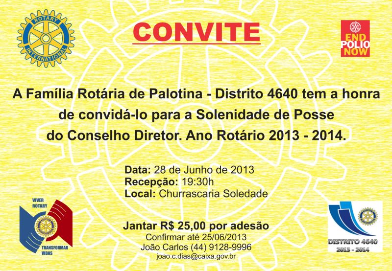 No dia 28 de junho de 2013 será realizada a posse do conselho diretor do ano rotário 2013-2014.